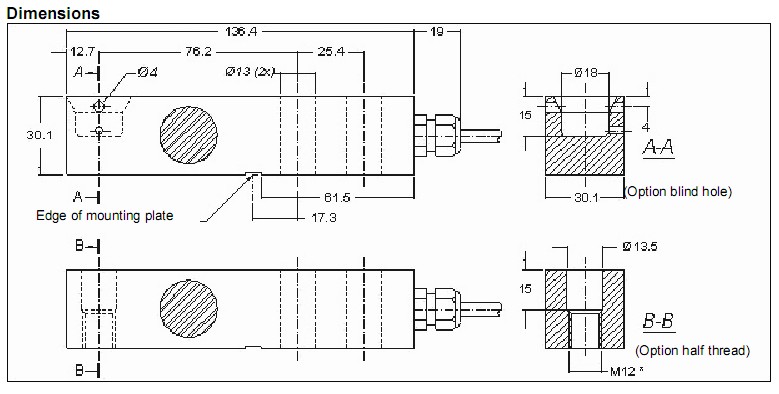 彎梁式稱重傳感器通過線纜一側(cè)的兩個(gè)緊固鉆孔安裝。而在線纜的另一側(cè),通過通孔或盲孔將力引入,垂直作用于測(cè)力傳感器的中軸線。另有一款半螺紋承載孔可供選擇。