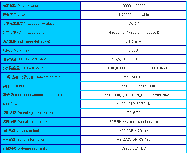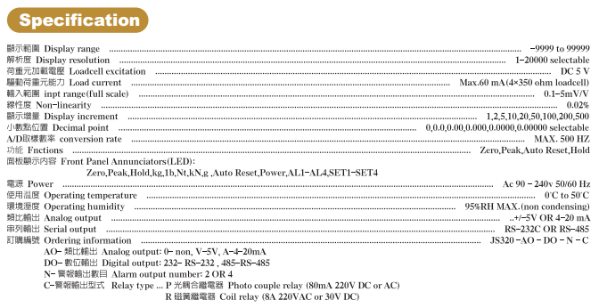 臺灣JIHSENSE JS-300稱重顯示控制器規(guī)格: