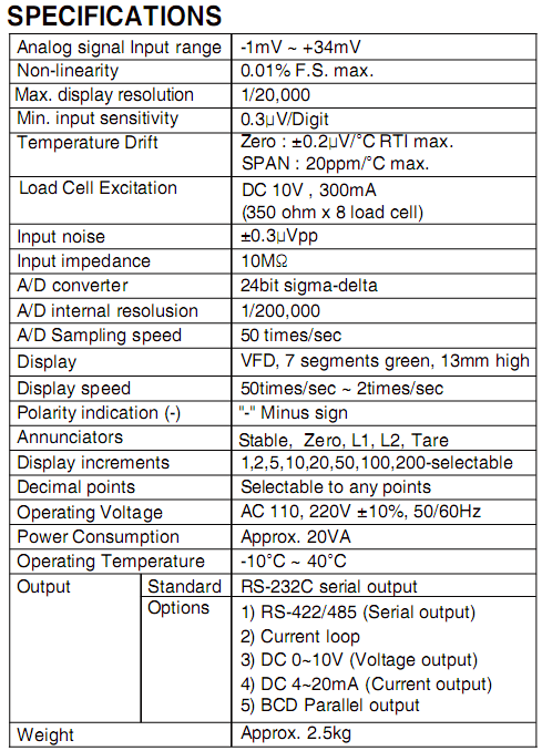 韓國Bongshin BS-7220稱重儀表技術(shù)指標(biāo)