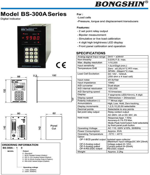 韓國Bongshin BS-300A稱重儀表技術(shù)指標(biāo)