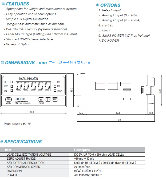 韓國CURIOSITY CTI-1000稱重顯示控制儀表產(chǎn)品參數(shù)尺寸