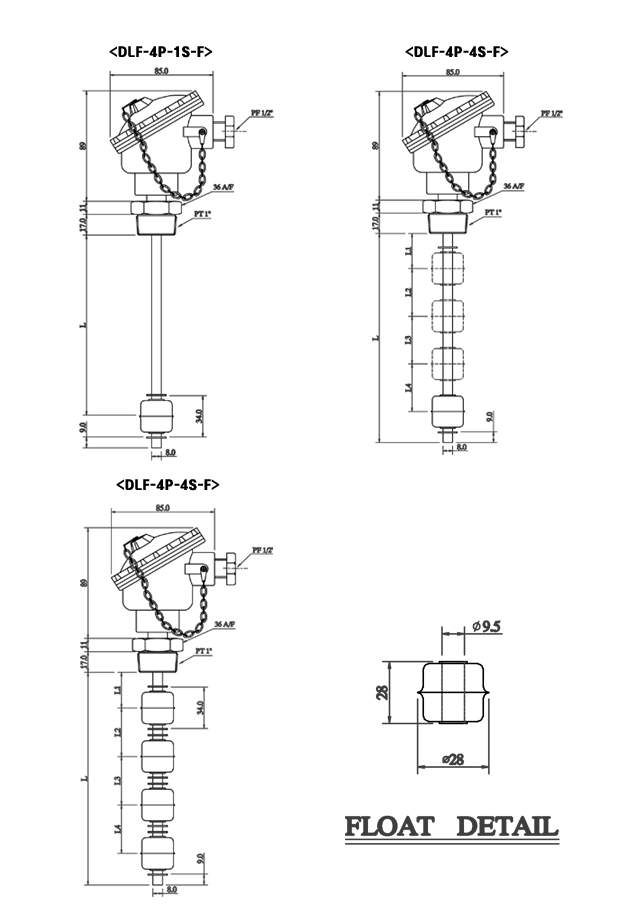DLF是控制體積小坦克迷你浮球液位開關,在傳感器簧片開關操作為浮子上下移動,其中安裝了一個永久磁鐵,這是一個使用通/斷信號從中繼級別開關。DLF - 4P(點)- 4S(STS)- GH(插座及缸蓋)是控制4 4花車每個接觸點液位開關。根據(jù)用戶的選擇,它可以產(chǎn)生輸出最多4個觸點信號。