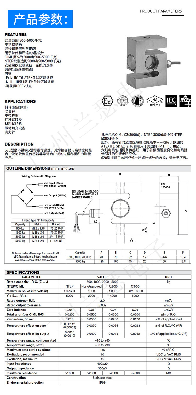 美國Tedea 620稱重傳感器產(chǎn)品參數(shù):