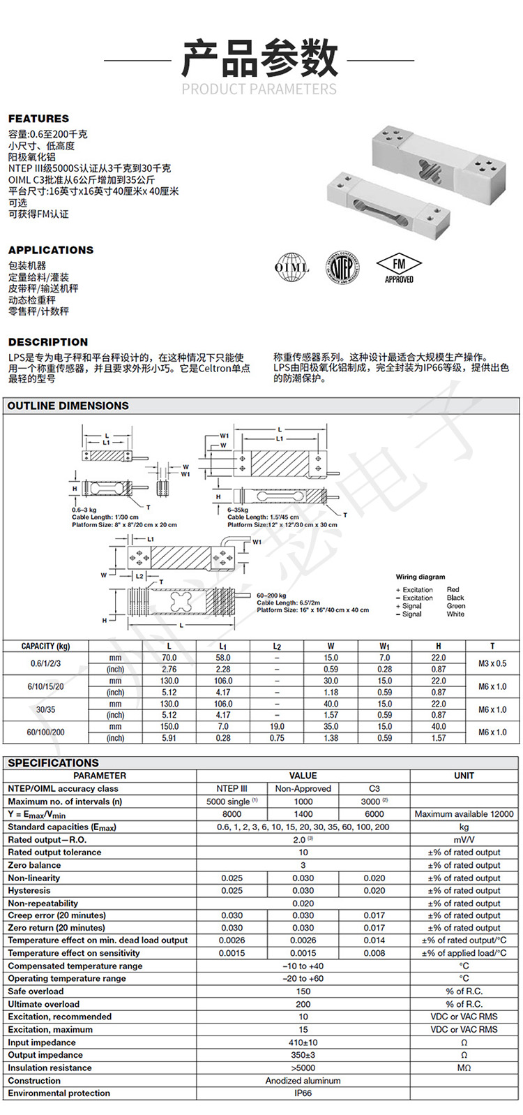 美國Celtron LPS-60kg稱重傳感器主要特性