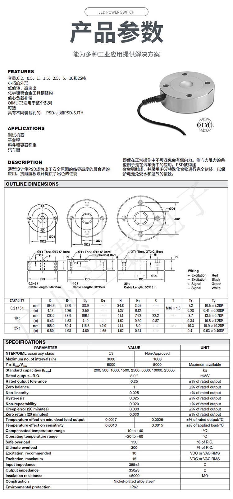 美國(guó)世銓Celtron PSD-200kg稱重傳感器技術(shù)參數(shù):