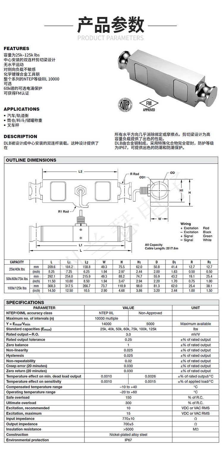 Celtron DLB-75KLB稱重傳感器應(yīng)用:車輛/鐵路稱重用,筒倉、漏斗、箱灌等稱重用,叉車秤