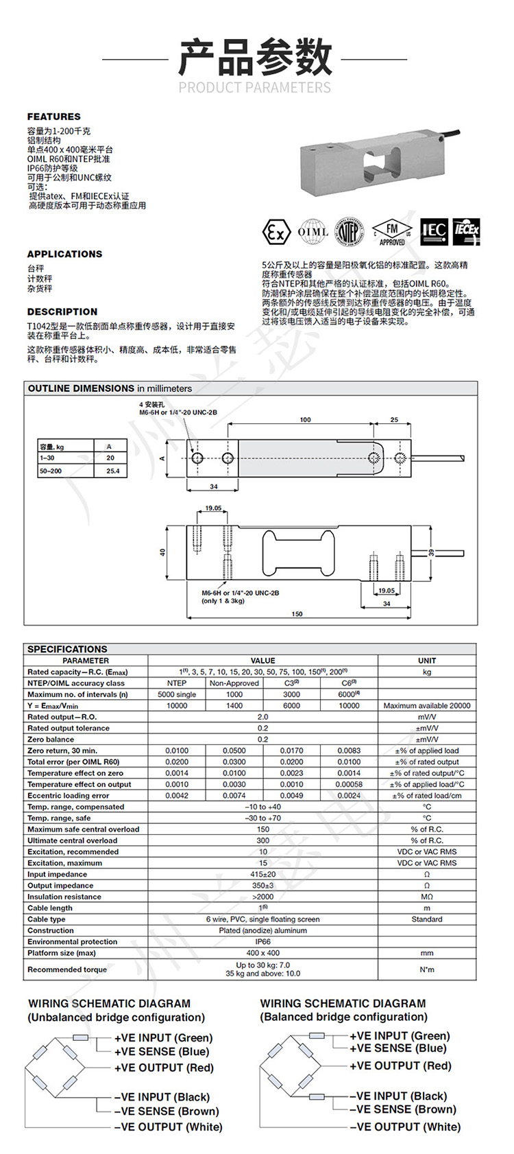 美國(guó)Tedea 1042-5kg稱重傳感器產(chǎn)品參數(shù):