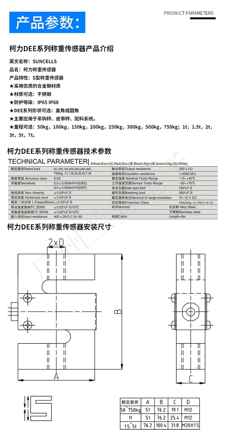 DEE-250KG稱重傳感器適用于材料試驗(yàn)機(jī)、配料秤、攪拌站、皮帶秤和包裝秤等