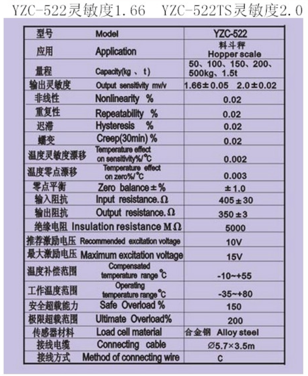 廣測GUANGCE YZC-522稱重傳感器技術(shù)參數(shù)