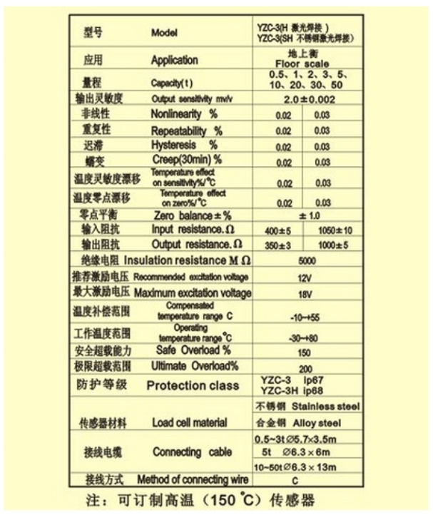 廣測GUANGCE YZC-3稱重傳感器技術(shù)參數(shù)