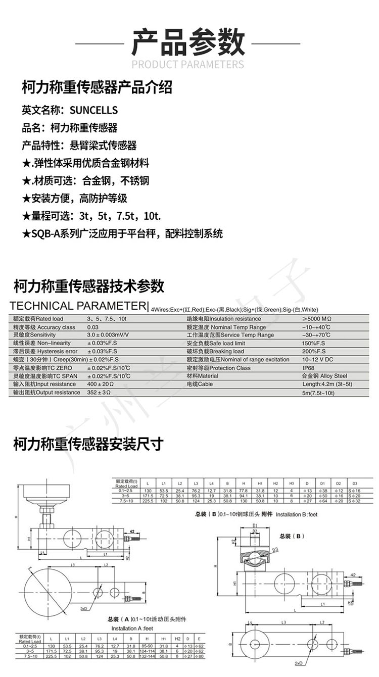 柯力SQB稱重傳感器主要參數(shù):