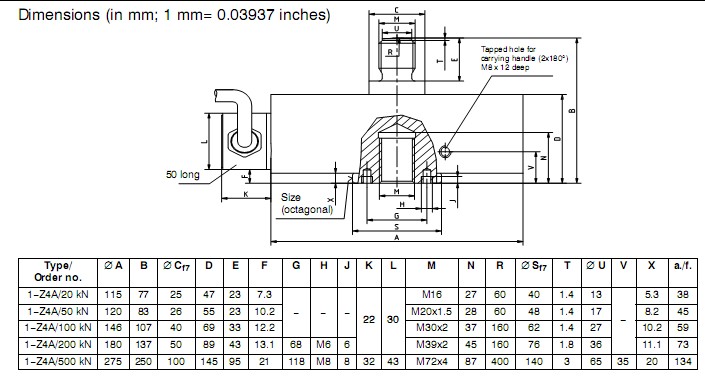 額定力20 kN, 50 kN, 100 kN, 200 kN, 500 kN