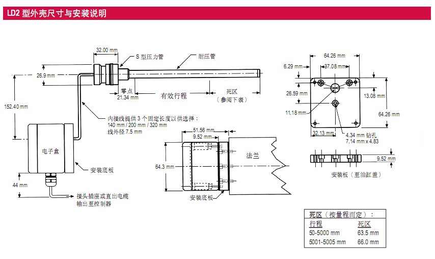 LD 與 LD2 型和 RD4 型外殼設(shè)計慨念相同,同樣是分體式,即電子頭和敏感元件是分開的。敏感元件的保護(hù)外管為不銹鋼制造,能承受高壓,可以直接裝進(jìn)液壓缸活塞裡,它與電子頭的連接利用一條內(nèi)接電纜把兩者連接起來。雖然內(nèi)接線不是狠長,但因為柔軟所以可以把電子頭從傳統(tǒng)的安裝在液壓缸的后端位置改為安裝在液壓缸的旁邊,把液壓缸的總長度減少。因此為液壓安裝但欠缺空間提供一個良好的解決方案,特別適用於兩端都帶耳環(huán)的液壓缸(即 Clevis Type)應(yīng)用。